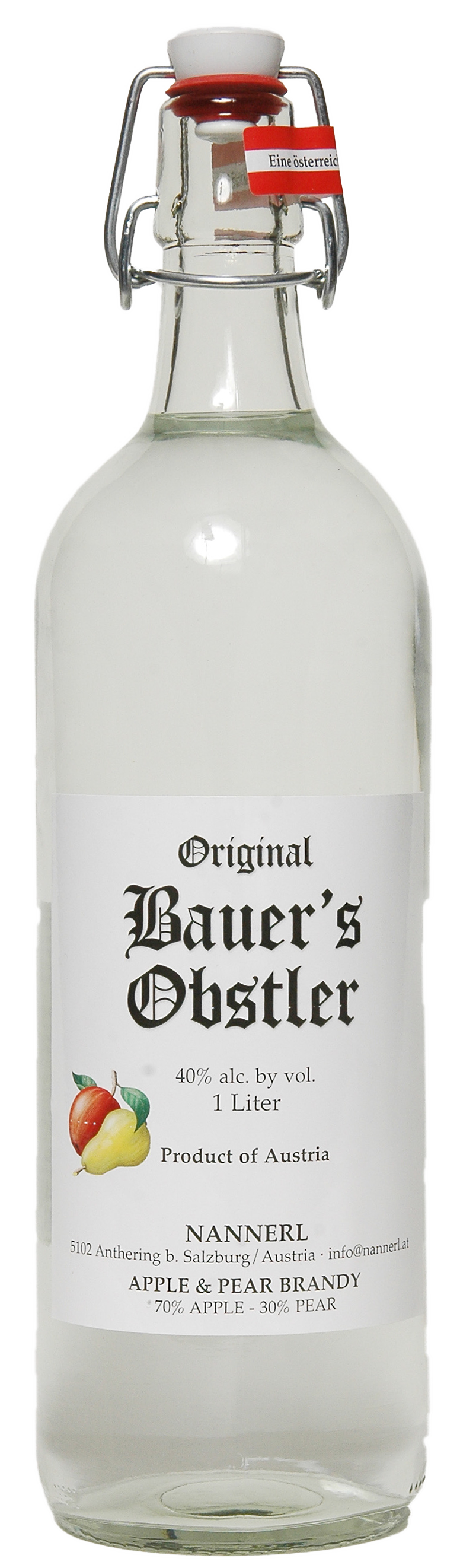 "Bauer's Obstler is a mix of fully ripened Austrian apples and pears that are fermented and distilled twice, creating a white brandy that is full of fruit flavors. The apple and pear flavors are immediately present in the mouth; the Obstler is down-to-earth and clear in character. The brandy spreads freshness and fruitiness on the palate. A very versatile spirit that can be enjoyed chilled, mixed or simply as an after dinner sipper." Tasting Notes