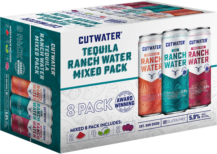 "Award-winning Cutwater tequila with soda water and juice is the base for our refreshing trio of Ranch Waters. Inspired by warm afternoons spent under southwestern skies, this mixed pack includes the classic lime along with refreshing watermelon and prickly pear." Tasting Notes
