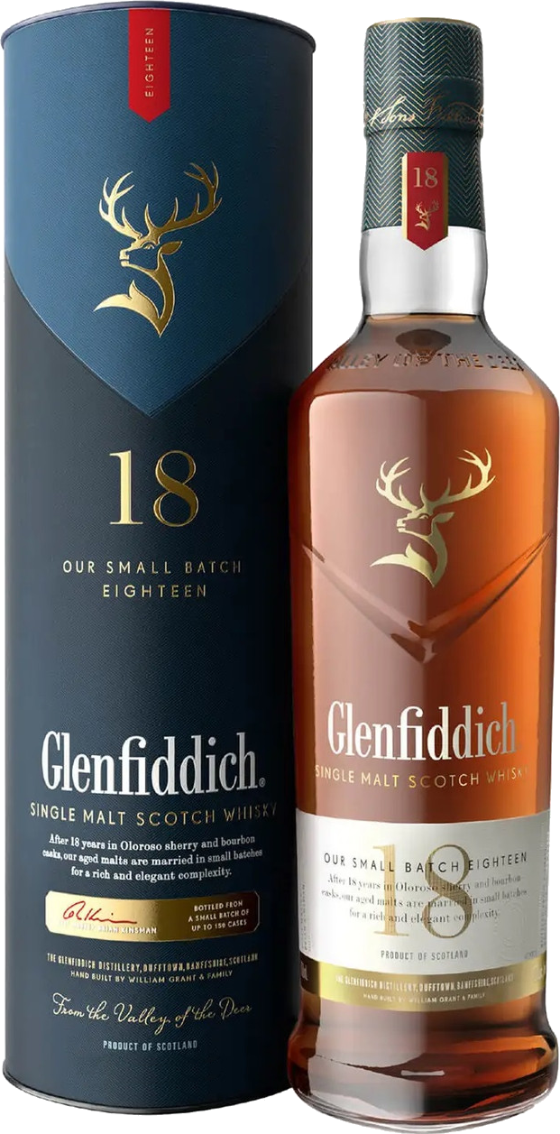 "Produced in small, individually numbered batches, Glenfiddich 18 Year Old combines a touch of fruity sweetness from the Spanish Oloroso wood and an oakiness from the traditional American casks. After being married in wooden tuns for at least three months, its rich, mellow flavors come together, creating an exceptionally smooth and remarkably deep single malt Scotch whisky with notes of baked apple, spice and robust oak. Each batch is unique and is of an extraordinary quality.