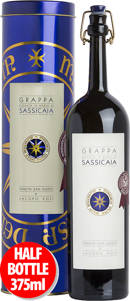 Single vintage Grappa from marc with an intense and aristocratic aroma distilled in small batches by means of steam, finished in the oak barrels in which the Sassicaia wine was previously refined.