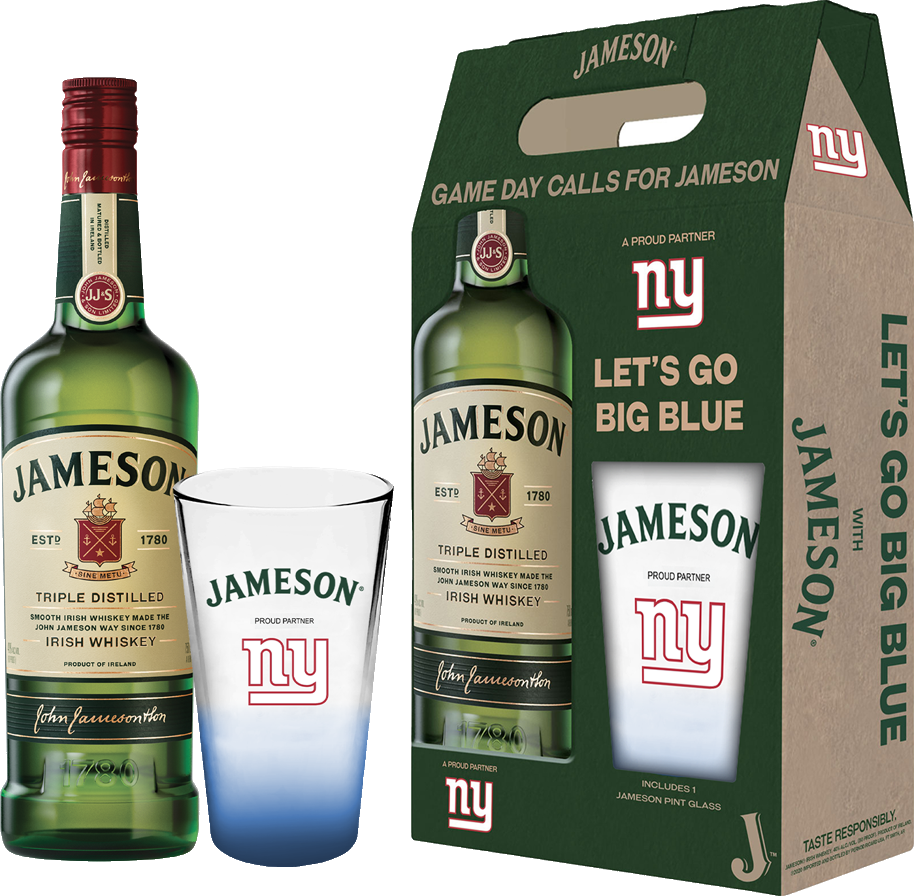 "The bouquet features charred paper smells of toasted walnuts, roasted chestnuts, paraffin, cardboard, parchment, dry grain and herbs. Entry is grainy sweet and moderately oily; the midpalate stage is loaded with grainy breakfast cereal flavors and, at times, even comes off like oatmeal. Ends well on an oily, satiny note." 85-89 Points, Wine Enthusiast Gift set includes one 750ml bottle of Jameson and a commemorative Giants Pint Glass
