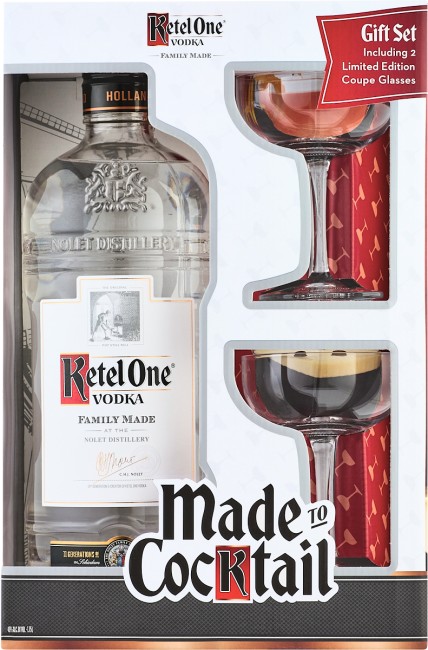 "Clear as rainwater. The bouquet doesn't reach up and grab you as much as it seduces you with gentle waves of mild spirit and grainy richness. The palate entry offers mild spiciness and cereal sweetness. Finishes marvelously long, doughy, round, subtly citrusy and moderately sweet. Classy, complex and multilayered." 90-95 Points, Wine Enthusiast Gift set includes one 1.75L of Ketel One and two Limited Edition Coupe Glasses.