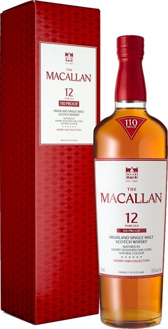 "Bottled at 55% to intensify and showcase the signature character of Sherry Oak 12 Years Old. The Macallan 110 Proof unlocks layers of character that invite deeper appreciation. The high strength intensifies the flavor, enriches texture, and deepen the complexity delivered by the influence of European Sherry seasoned oak casks. Matured for 12 years in predominantly European sherry seasoned oak casks highlights the power of oak in delivering up to 80% of flavor and 100% of natural color upon maturation."