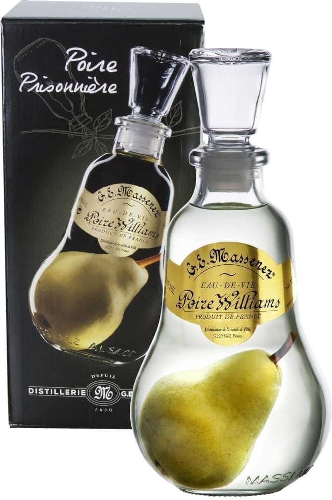 "In spring, when fruit from the pear tree begins to appear, it is trapped inside a bottle hung on the tree. The pear then gows inside the bottle until it reaches its optimum size. The bottles, which are then taken down with their fruit, are put in different alcohol baths before the final Eau-de-Vie is added, which will soak up the flavors of the ripe fruit. Finesse and elegance on the palate, an intense pear taste that brings great greshness. To be served cool or at room temperature." Producer Notes
