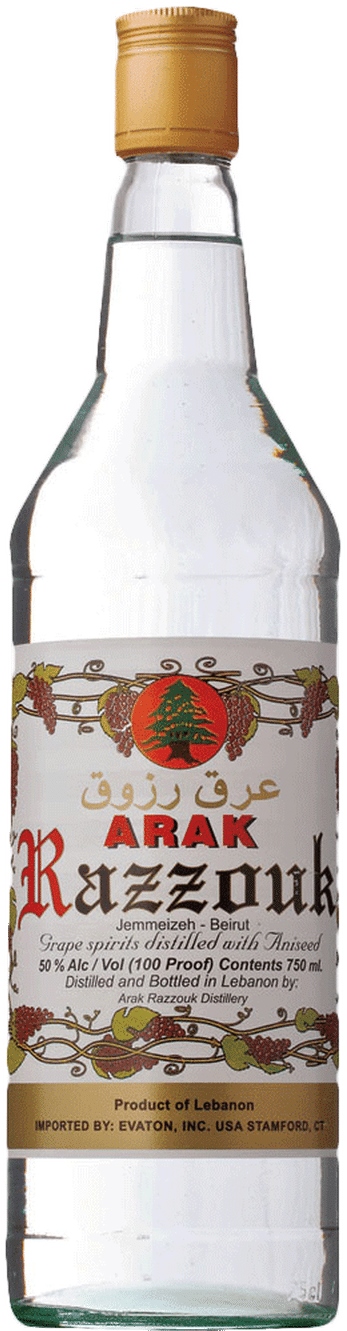 "Arak Razzouk an anise-based spirit from Lebanon has a truly distinctive flavor which has made it the national beverage of its mother country. Tracing its roots to the early 18th century, Arak Razzouk has provided this traditional refreshment for generations. Arak Razzouk, is made from special varieties of sweet mountain grapes, which are crushed, fermented, and then distilled over a low fire and aged and mellowed for at least six months. Today, it's enjoyed on the rocks with an equal amount of water." Tasting Notes
