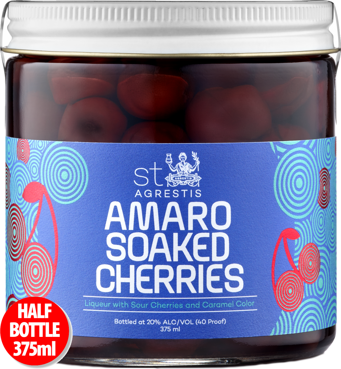 "Made using sour Balaton cherries sourced from Michigan, the cherries are macerated in St. Agrestis Amaro. St. Agrestis has implemented the traditional process of macerating the cherries to impart the herbal, bittersweet and savory amaro flavors onto the naturally tart cherries. With a satisfying texture and a complex rich, yet not overly sweet, sour, spiced syrup. A perfect match for a wide variety of drinks ? from Manhattans to Whiskey Sours, or simply mixed with soda and bitters." Tasting Notes