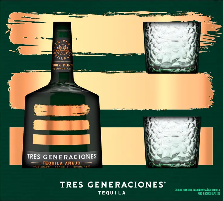 "Has a rich, 100% blue agave flavor enhanced by 12 months in toasted American oak barrels where it gains its delicate amber hue. Full and balanced. Starts with brown sugar, fades to soft oak and clean agave with a unique smooth, smoky finish." Tasting Notes Gift set includes one 750ml bottle of Tres Generaciones Anejo and two rocks glasses.