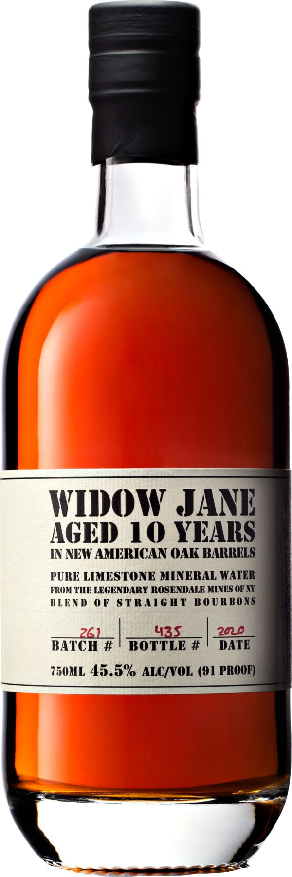 "Reviving the lost art of marrying the finest whiskeys, Widow Jane 10 Year Old is our signature bourbon. Hand assembled in Brooklyn using the richest and rarest straight bourbons, only ever in 5 barrel batches, non-chill filtered and proofed with our own mineral water from the legendary Rosendale Mines of NY, we deliver a whiskey unique in its intensity & complexity. Notes of orange, maple, cherry, and almond on the palate with charred oak and spice on the finish." Distiller's Notes