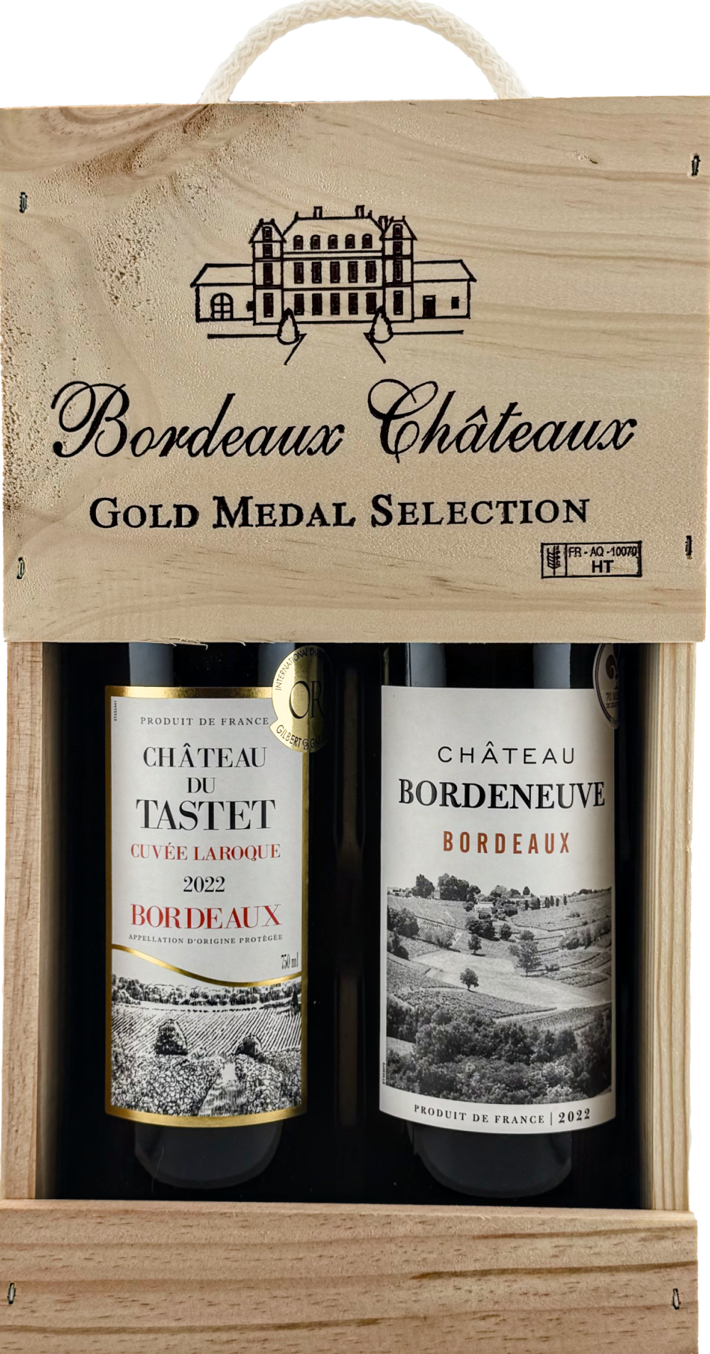 "Each gift set includes one bottle of Chateau Bordeneuve 2021 and Chateau du Tastet Cuvee Laroque 2021 Bordeaux. Award winning red fruit flavor and velvety tannins make both of these wines perfect pairings for meals featuring hearty beef dishes, venison, and aged cheeses." Tasting Notes