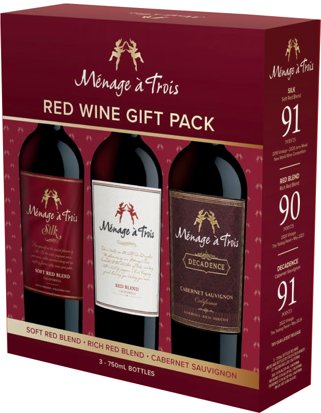 "This collection is perfect for lovers of California reds. Contains the following: Menage A Trois' Classic Red Blend Menage A Trois Silk- a smooth and appropriately silky, red fruit forward blend of Pinot Noir, Malbec, and Petite Syrah Menage A Trois Midnight - a bold, merlot dominant blend that brings dark fruit and chocolate."