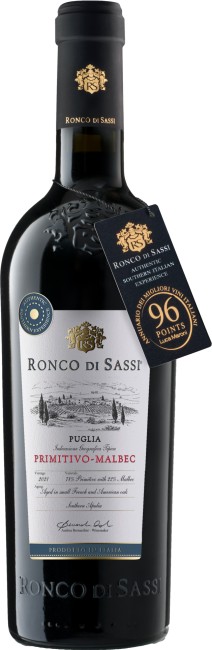 "A blend of 78% Primitivo and 22% Malbec. They said it couldn't be done, but to create a new experience you must do something that's never been done before; so, when the winemaker saw how well Malbec grows in Puglia, he challenged tradition and married it with Primitivo. The result is Ronco di Sassi, a unique southern blend of two grapes typically associated with two different hemispheres." Winemaker's Notes 96 Points, Luca Maroni